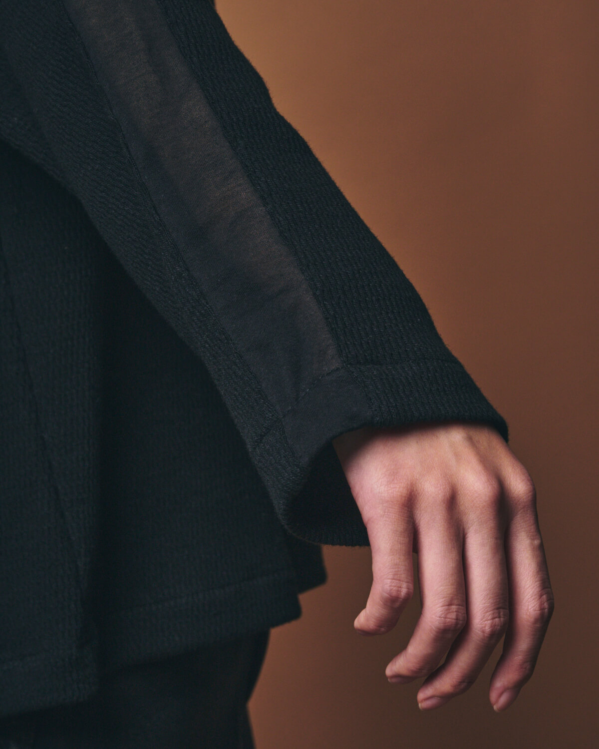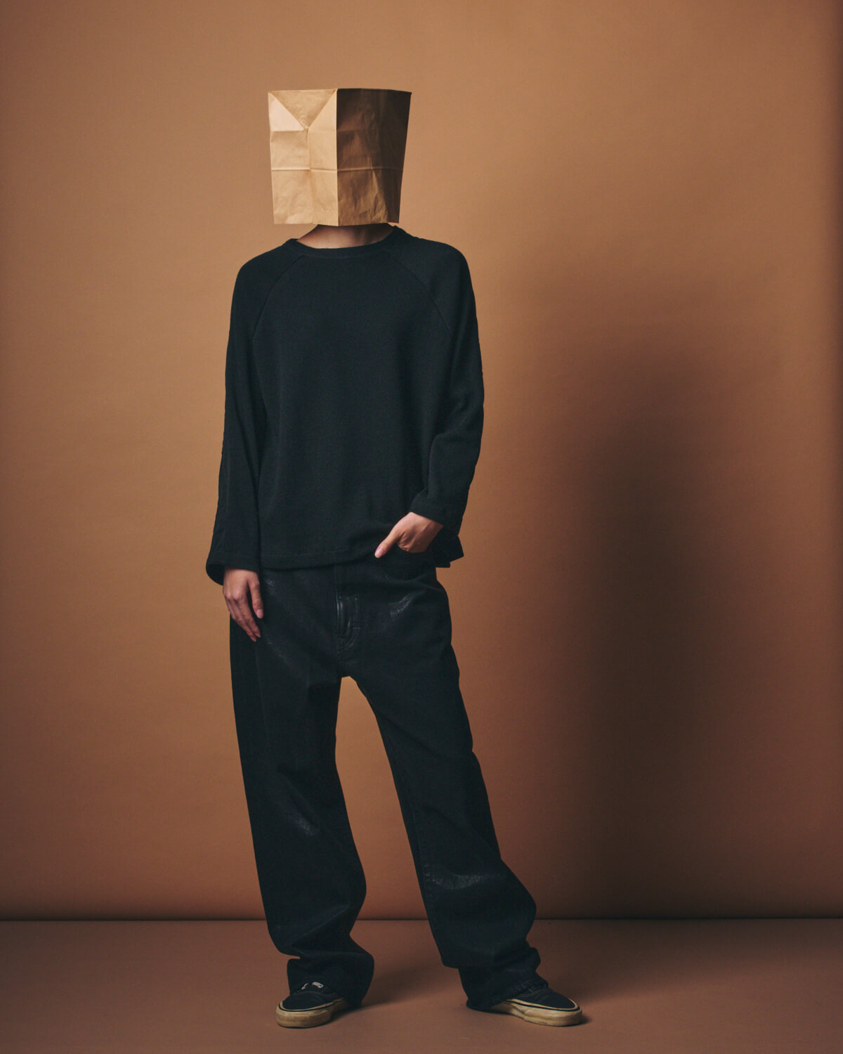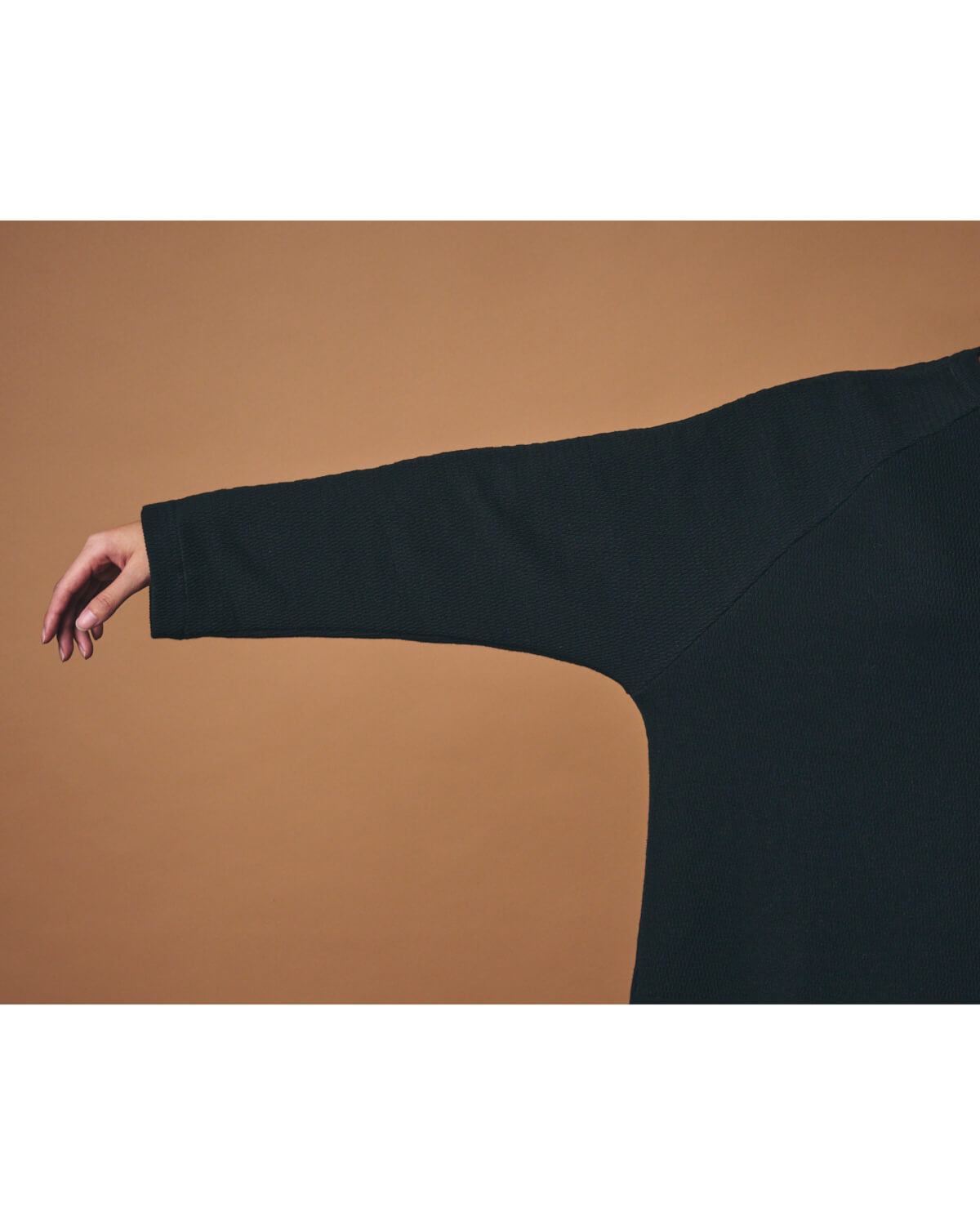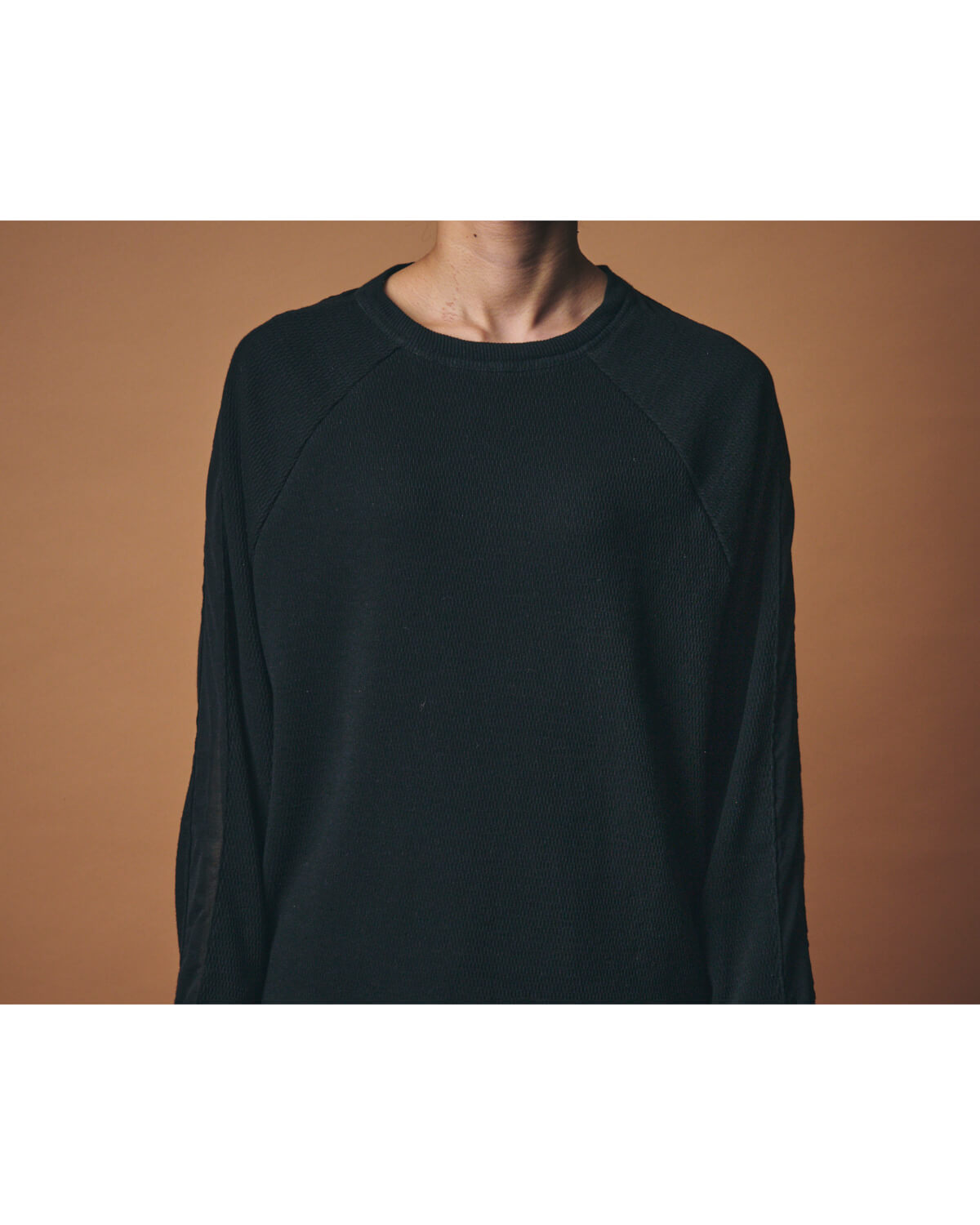 – MADE IN JAPAN– コットン100%のサーマル生地を使用した、ラグランスリーブのロングスリーブカットソー[m.u SHEER LINE THERMAL]。 表面に凹凸のある生地感が特徴のサーマルは、肌触りが良く、とても着心地の良いアイテム。 生地の凹凸によって空気層がつくられるため、保湿性にとても優れており、肌に接する面積が少ないことで生まれる肌離れの良い着用感によって、通気性が良くて蒸れにくいという特徴も併せ持っています。 シルエットは、アームホールをゆったりととりながらも、袖の幅は太すぎず細すぎない絶妙なバランスに設計。 そこに、襟ぐりから肩、袖口へと沿うように透け感のあるシアー素材の生地をライン状に挟み込みました。 ラフなカジュアル感を持ちながらも、シアーの透け感が上品さと艶っぽさを演出してくれています。 裾や袖口にはリブをあえて施さず、ミニマルで洗練された印象に仕上げました。 腕時計やアクセサリーが自然に覗く仕様もポイント。 シンプルながらもデザイン性に富んだ1着で、毎日のスタイリングをアップデートしてくれます。 カラーは、合わせやすくスタイリングを引き締める「Black」と、柔らかく抜け感のある「Off-White」の2色展開。 カジュアルにもモードにも馴染む万能な一枚となっています。