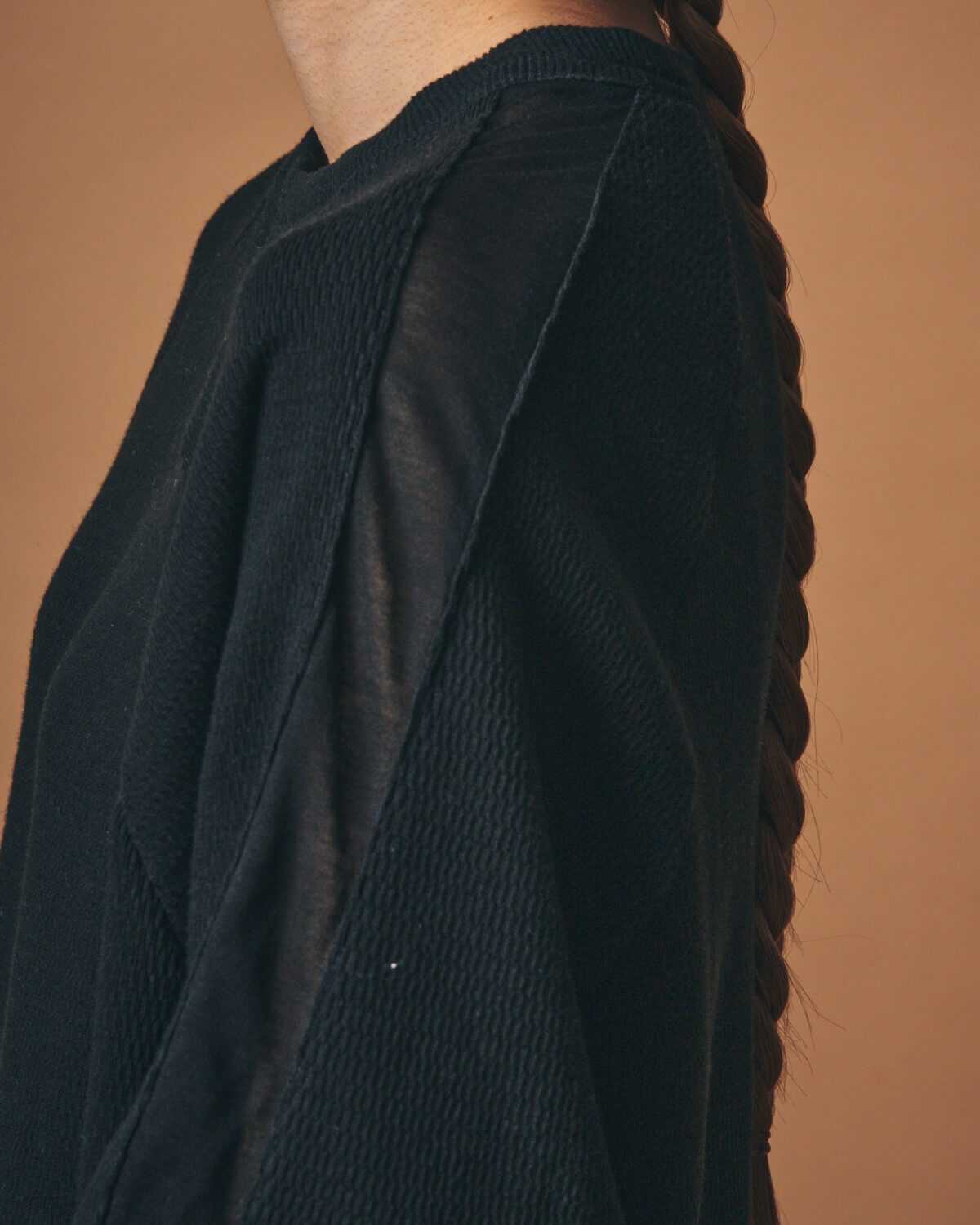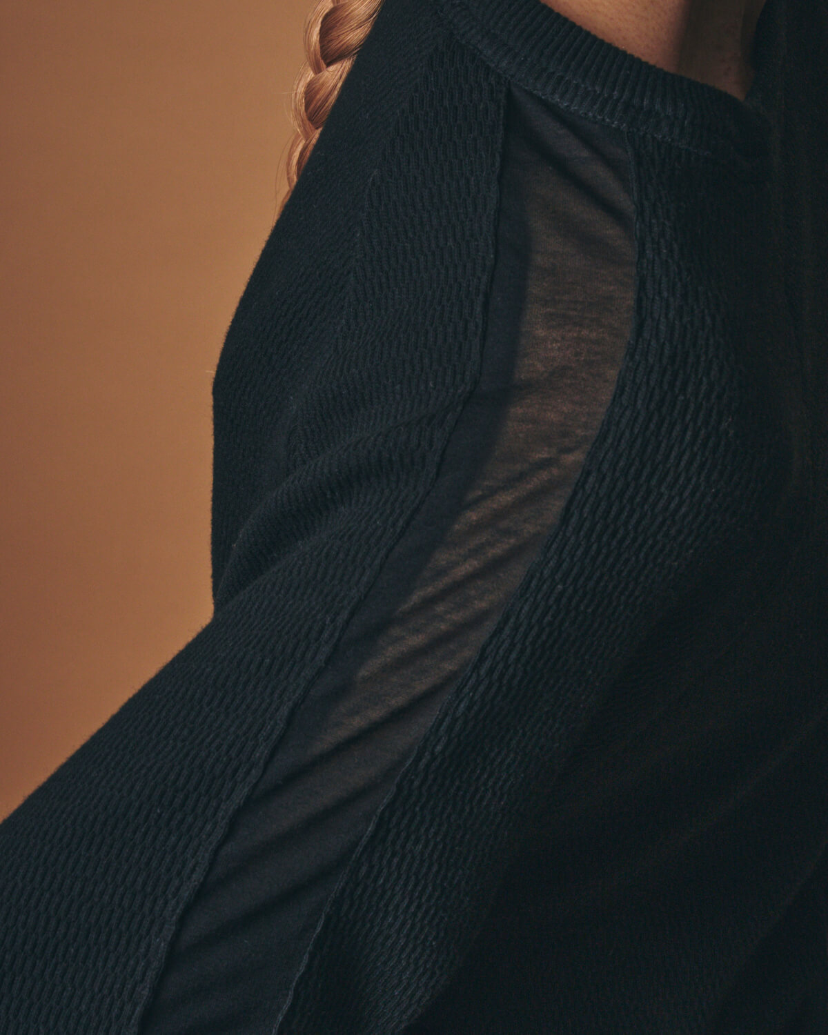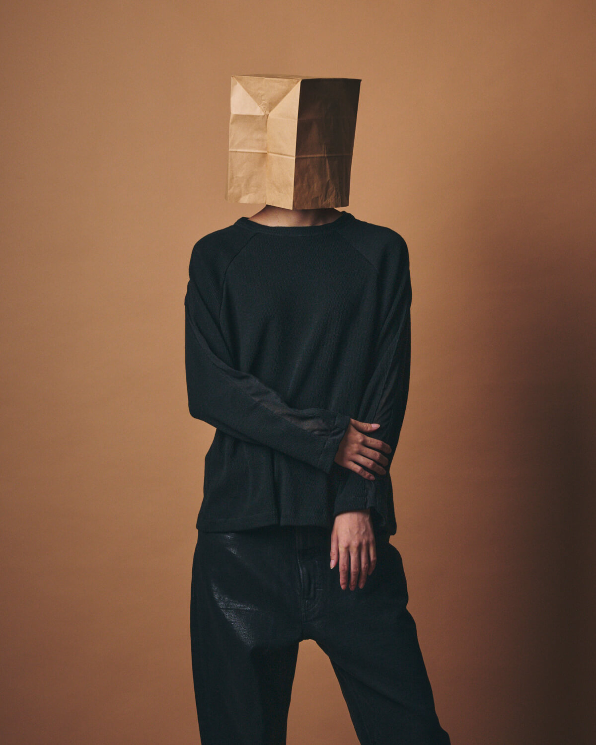 – MADE IN JAPAN– コットン100%のサーマル生地を使用した、ラグランスリーブのロングスリーブカットソー[m.u SHEER LINE THERMAL]。 表面に凹凸のある生地感が特徴のサーマルは、肌触りが良く、とても着心地の良いアイテム。 生地の凹凸によって空気層がつくられるため、保湿性にとても優れており、肌に接する面積が少ないことで生まれる肌離れの良い着用感によって、通気性が良くて蒸れにくいという特徴も併せ持っています。 シルエットは、アームホールをゆったりととりながらも、袖の幅は太すぎず細すぎない絶妙なバランスに設計。 そこに、襟ぐりから肩、袖口へと沿うように透け感のあるシアー素材の生地をライン状に挟み込みました。 ラフなカジュアル感を持ちながらも、シアーの透け感が上品さと艶っぽさを演出してくれています。 裾や袖口にはリブをあえて施さず、ミニマルで洗練された印象に仕上げました。 腕時計やアクセサリーが自然に覗く仕様もポイント。 シンプルながらもデザイン性に富んだ1着で、毎日のスタイリングをアップデートしてくれます。 カラーは、合わせやすくスタイリングを引き締める「Black」と、柔らかく抜け感のある「Off-White」の2色展開。 カジュアルにもモードにも馴染む万能な一枚となっています。
