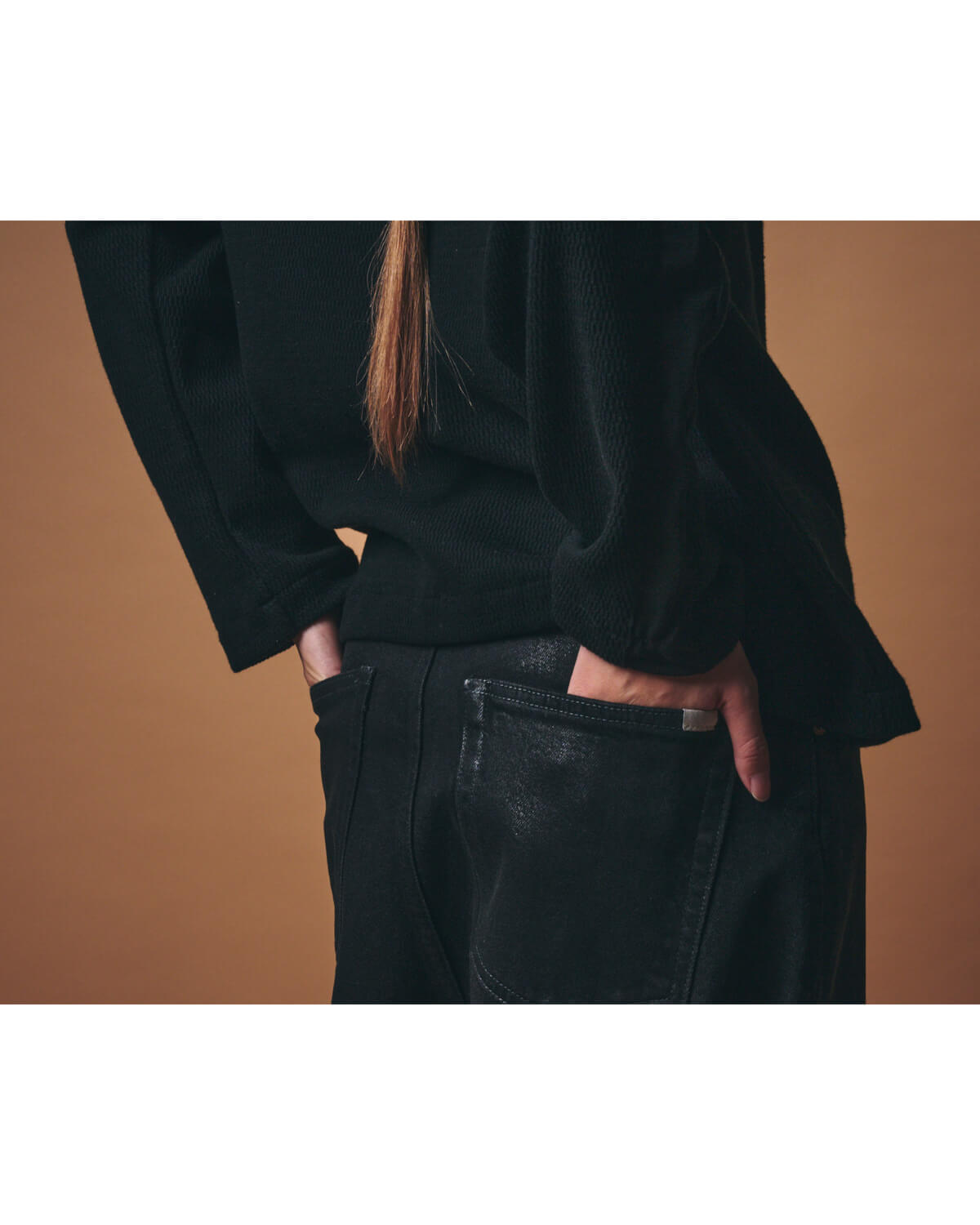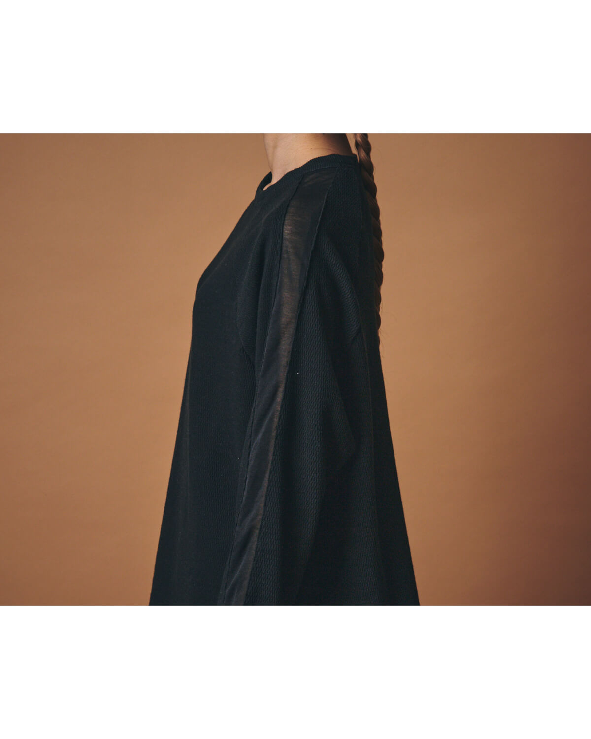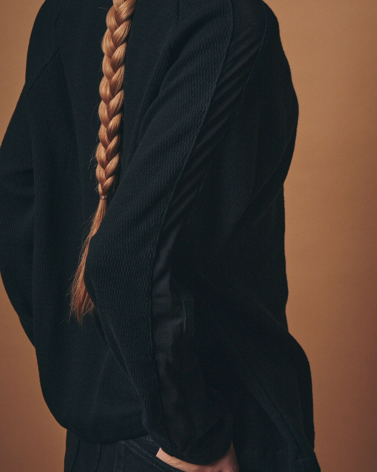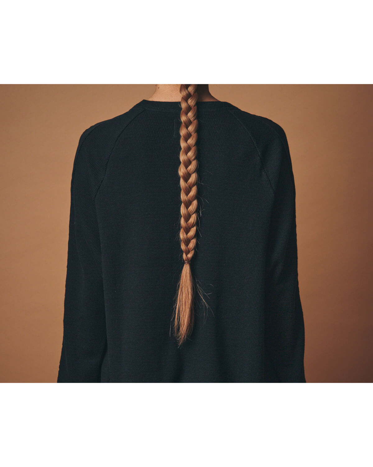 – MADE IN JAPAN– コットン100%のサーマル生地を使用した、ラグランスリーブのロングスリーブカットソー[m.u SHEER LINE THERMAL]。 表面に凹凸のある生地感が特徴のサーマルは、肌触りが良く、とても着心地の良いアイテム。 生地の凹凸によって空気層がつくられるため、保湿性にとても優れており、肌に接する面積が少ないことで生まれる肌離れの良い着用感によって、通気性が良くて蒸れにくいという特徴も併せ持っています。 シルエットは、アームホールをゆったりととりながらも、袖の幅は太すぎず細すぎない絶妙なバランスに設計。 そこに、襟ぐりから肩、袖口へと沿うように透け感のあるシアー素材の生地をライン状に挟み込みました。 ラフなカジュアル感を持ちながらも、シアーの透け感が上品さと艶っぽさを演出してくれています。 裾や袖口にはリブをあえて施さず、ミニマルで洗練された印象に仕上げました。 腕時計やアクセサリーが自然に覗く仕様もポイント。 シンプルながらもデザイン性に富んだ1着で、毎日のスタイリングをアップデートしてくれます。 カラーは、合わせやすくスタイリングを引き締める「Black」と、柔らかく抜け感のある「Off-White」の2色展開。 カジュアルにもモードにも馴染む万能な一枚となっています。