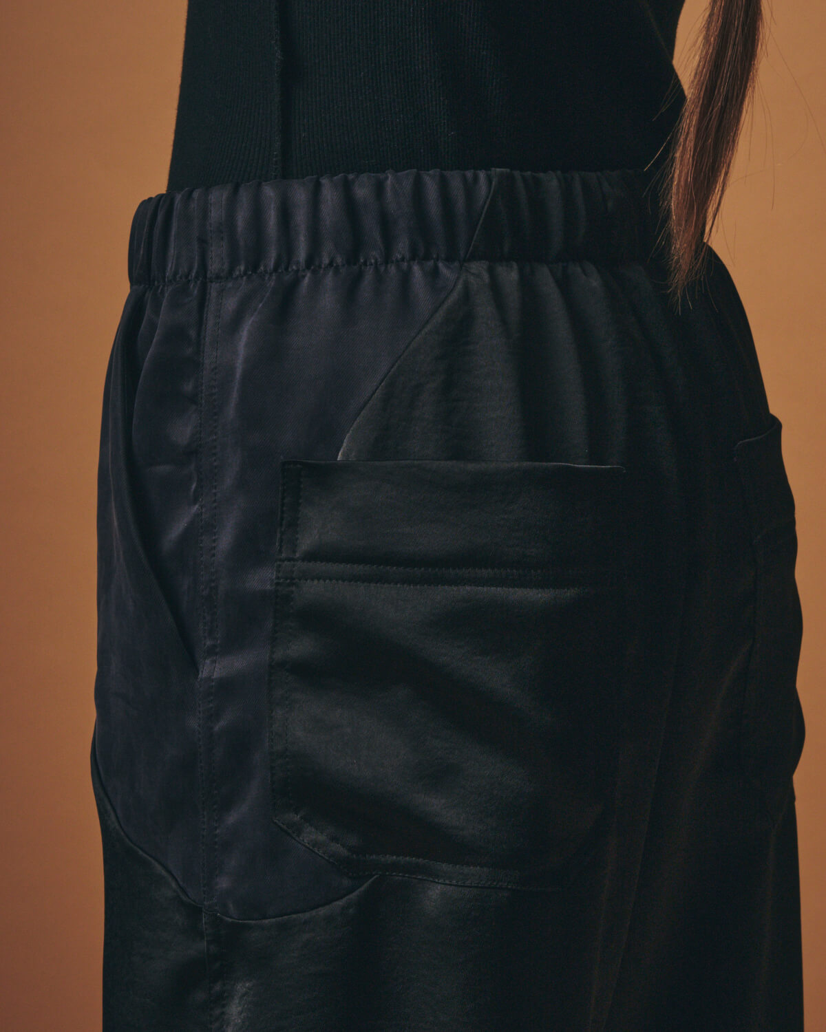 – MADE IN JAPAN– 程よい光沢が上品な印象を与えるポリエステルサテンにヴィンテージ加工を施し、ナチュラルなルックスとなめらかなタッチ、そしてゆるやかに落ちる美しいドレープを表現した生地と、横糸に大番手のキュプラスパンを使用し、特殊な圧縮加工によってふくらみと肉感を持たせながらもドレープ感を兼ね備えた太畝ツイル組織のキュプラサテン、さらにフィブリル加工による独特のヴィンテージ感を備えた生地。 この二種類の上質なサテンを組み合わせ、贅沢な切り替えを施した[m.u Silky Satin Pants]。 シワになりにくく、脚のラインを拾いすぎない落ち感のあるシルエットは、どんなトップスと合わせても一気に大人のムードへ引き上げてくれ、装いの幅を広げてくれます。 ウエストはゴムと紐のストレスフリーのイージー仕様。 レングスはミディアムワイドのストレートラインで、日常に取り入れやすいバランスへと整えています。 しなやかなサテン地をベースに、左ウエスト・右裾には、曲線ラインで別生地を切り替えるm.u独自のデザインを採用。 配色が強く主張しすぎないよう、曲線のラインで柔らかく溶け込むように配置し、綺麗さと遊び心を絶妙なバランスで成立させています。 カラーはBlack × Navy、Gold Beige × Pink Beigeの2パターン。 落ち着いた配色ながらも存在感のある、計算されたカラーを揃えました。 ポケットは計4つ。 ヒップポケットはあえて通常より下めに設定することで、トップスの裾からさりげなく覗くバランスを実現。 細部に至るまで徹底してこだわり抜いた、m.uらしい“大人のヴィンテージ感”漂う一本に仕上がりました。