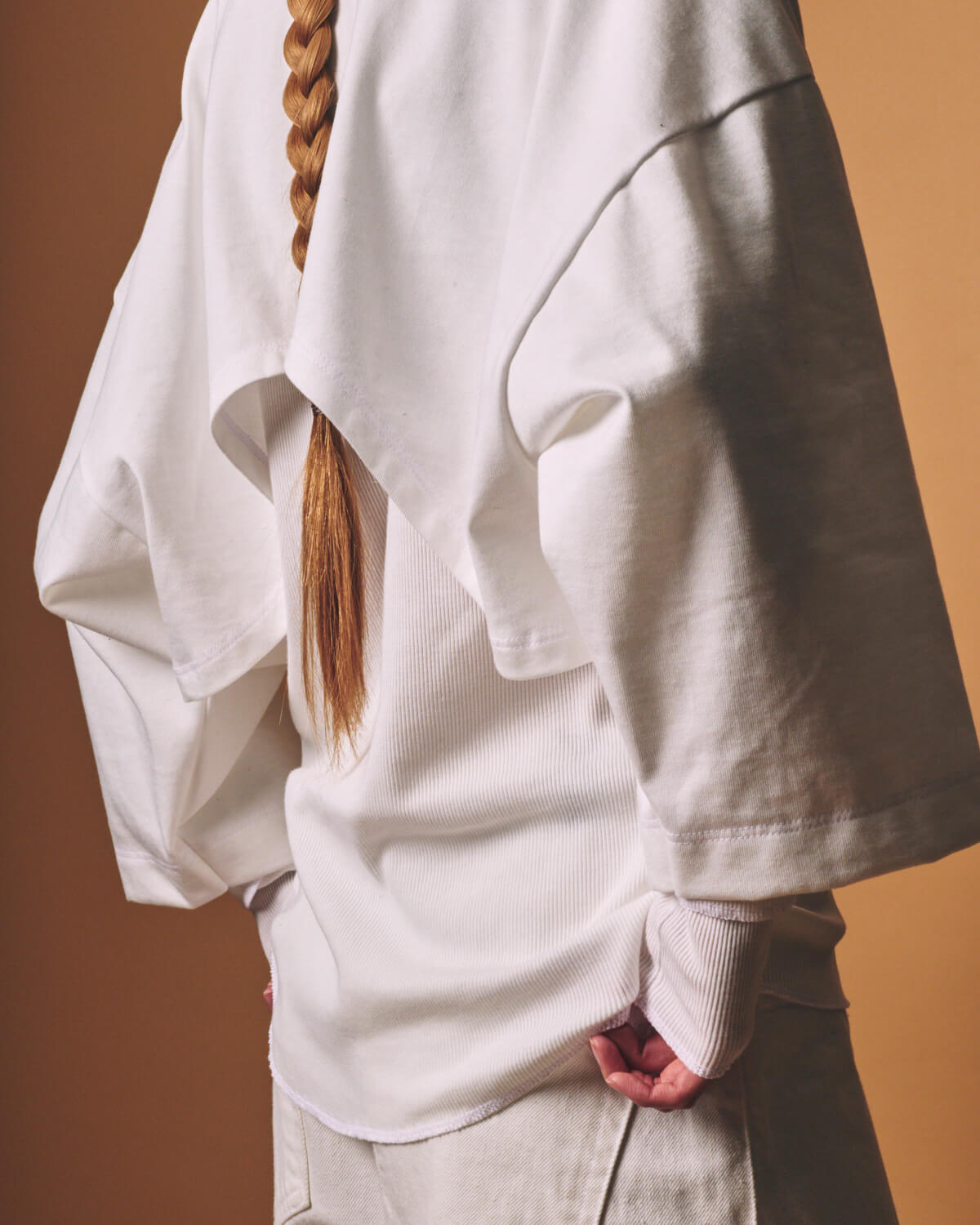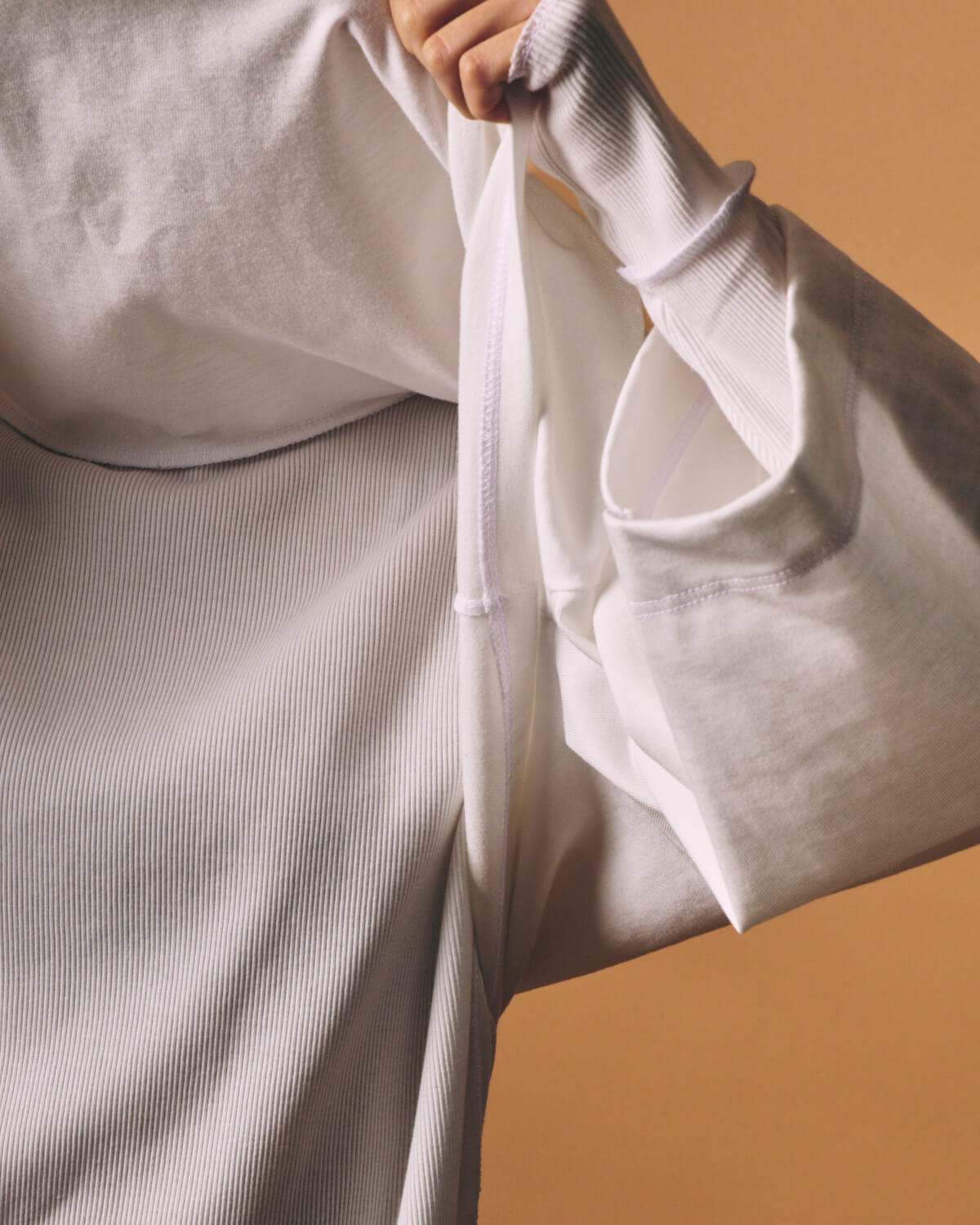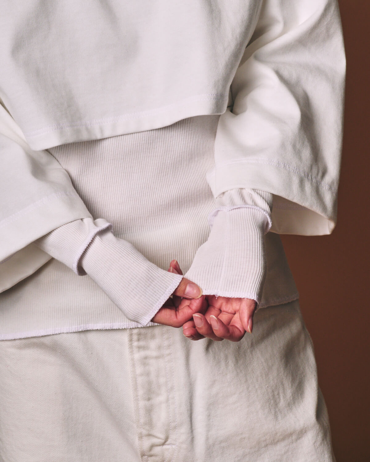 – MADE IN JAPAN– [PRE_ CROP LAYERED LS]をベースに、生地と全体のバランスを見直し再構築した[m.u × PRE_ CROP LAYERED RIB LS]。 襟ぐりのみを縫い合わせたレイヤードプルオーバーとなっており、異なる質感とシルエットを持つ2枚のトップスをひとつの形として設計しました。 インナーには、ORGANIC FIELD® を使用したテレコ素材を採用。 繊維長の長い糸によるソフトなタッチと整った目面が特長で、程よい肉感のためシーズンレスにご着用いただくことが可能です。 インナーのフォルムは[m.u RIB L/S]をベースに、身体に沿いすぎない絶妙なフィット感に仕上げました。 上から重ねたトップスには、ヘビーウェイトな糸を度詰めで編み立てた天竺素材の生地を使用しており、パキッとしたハリとコシのある生地感が特徴です。 しっかりとした質感のトップスと柔らかなリブインナー。 対照的な素材同士が重なることで、奥行きのあるバランスを生み出します。 着丈と身幅は前後でパターンを変更。 インナーは前をやや短く、後ろを長めに設定しており、トップスは前裾をフラットに、後ろは短めのカーブラインに仕上げました。 また、幅広の8分丈スリーブが、袖口から覗くリブとのコントラストをより際立たせくれています。 カラーは Black / White / Grey の3色展開。 クロップド丈でありながら、二重構造のレイヤードが全体のバランスを自然に整えてくれるため、タックイン、アウト、どちらも美しく決めてくれる、スタイリングの幅を広げるアイテムとなっています。