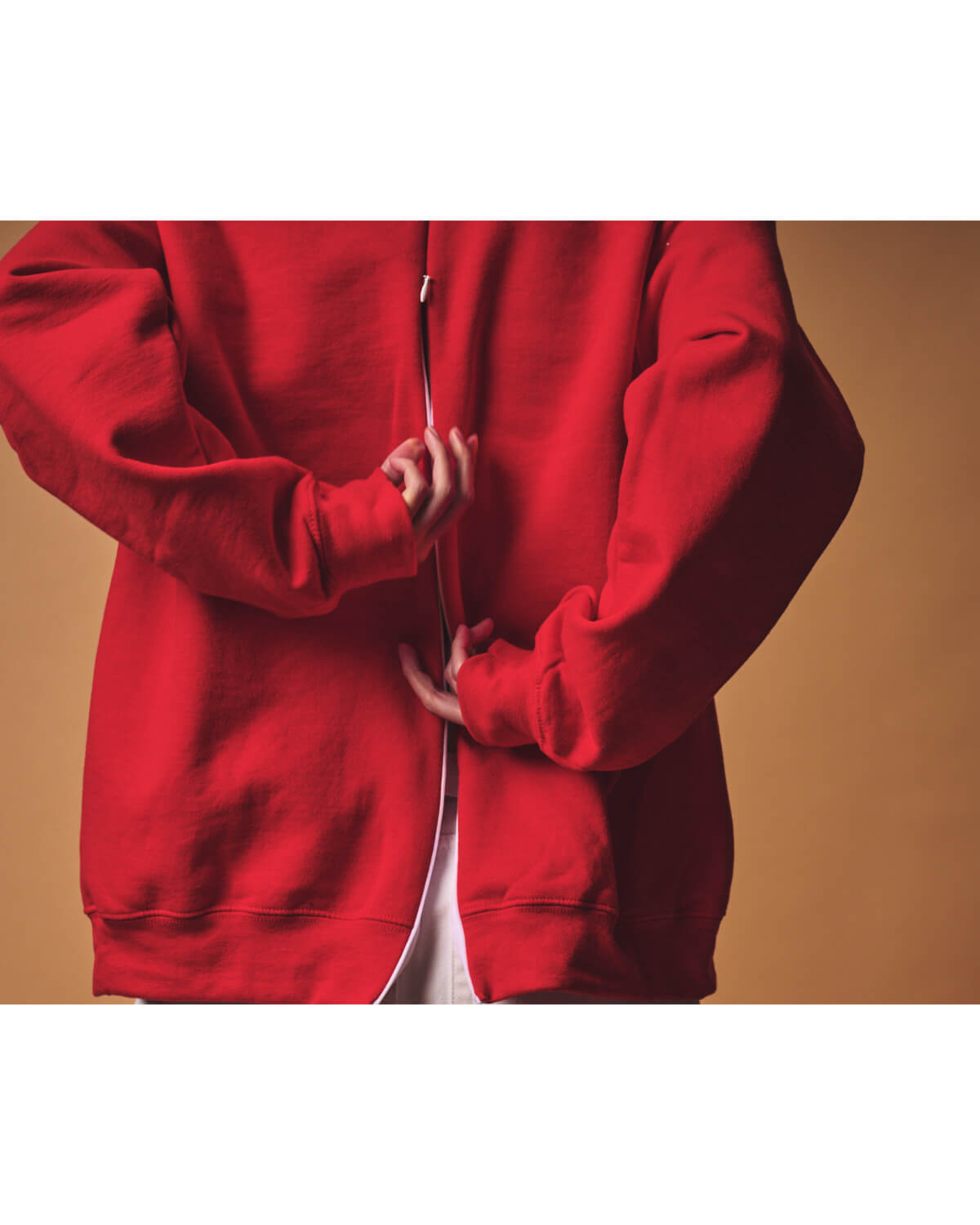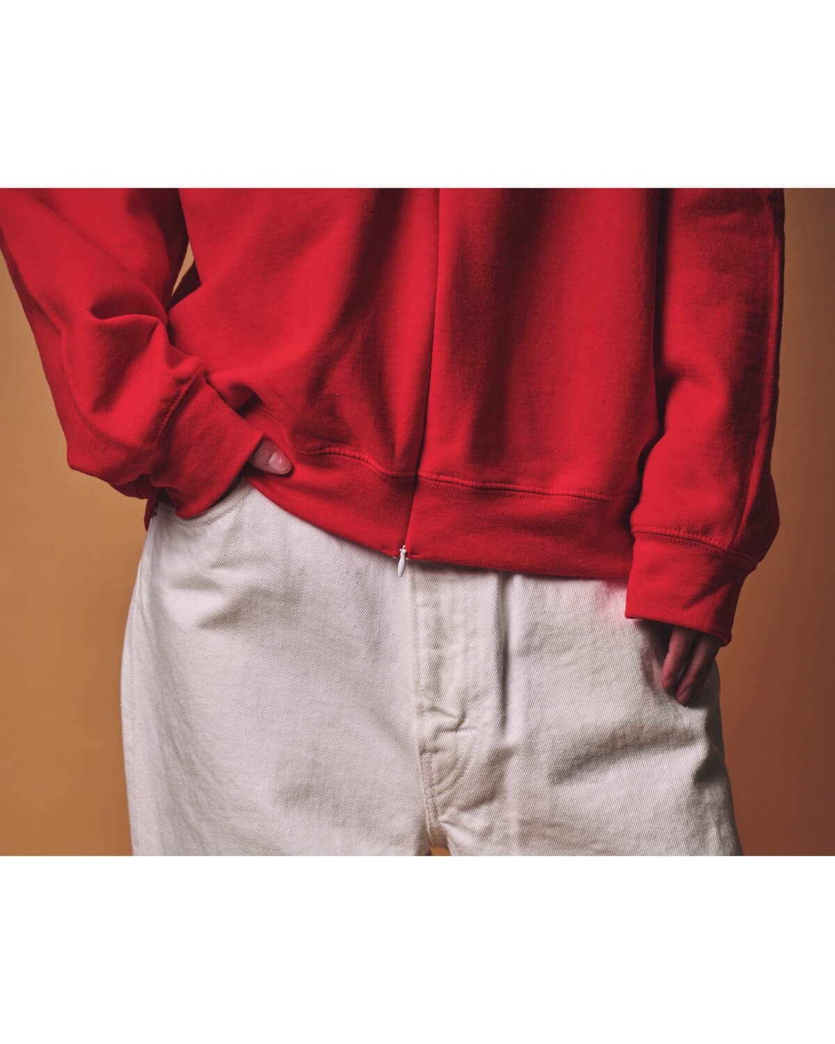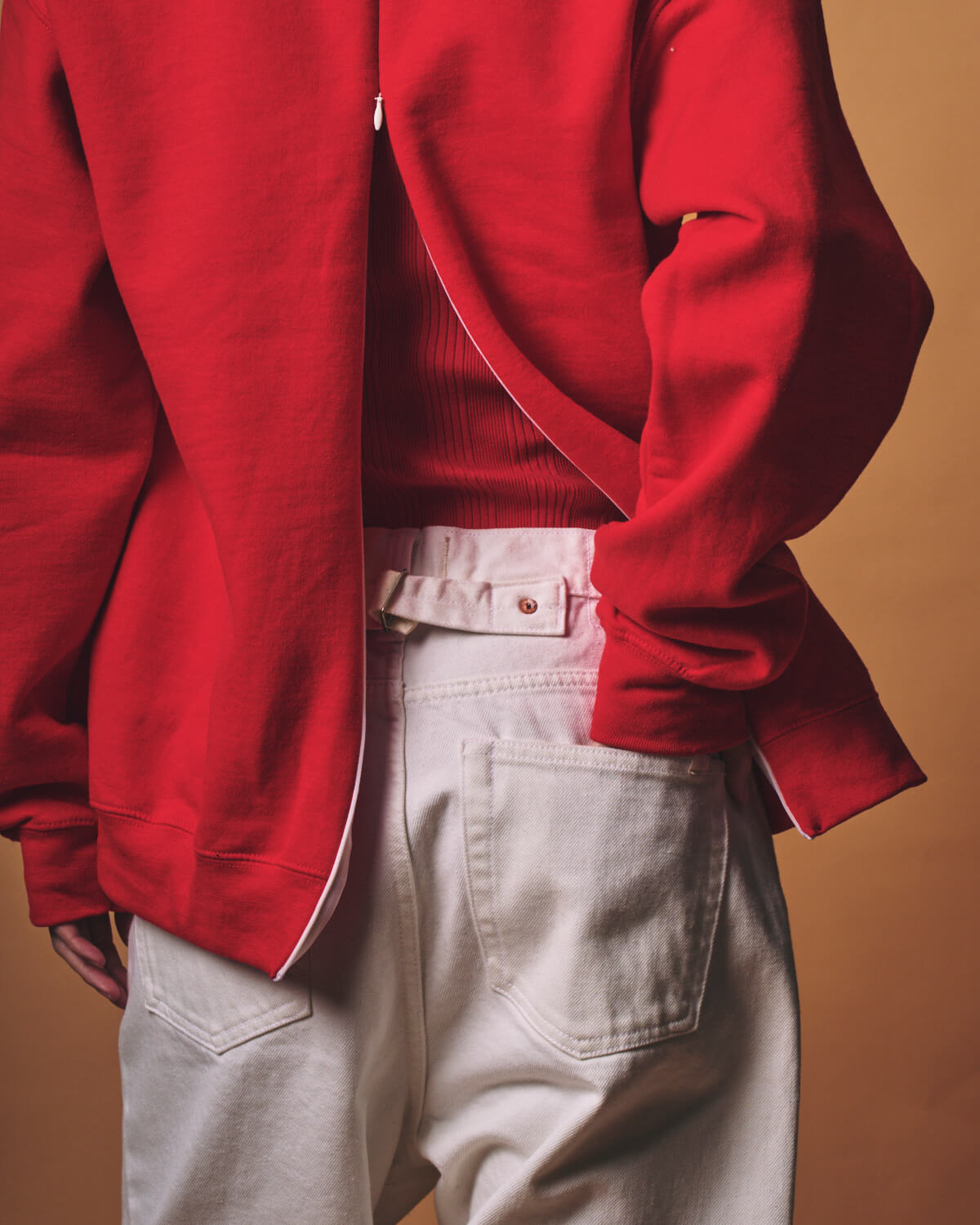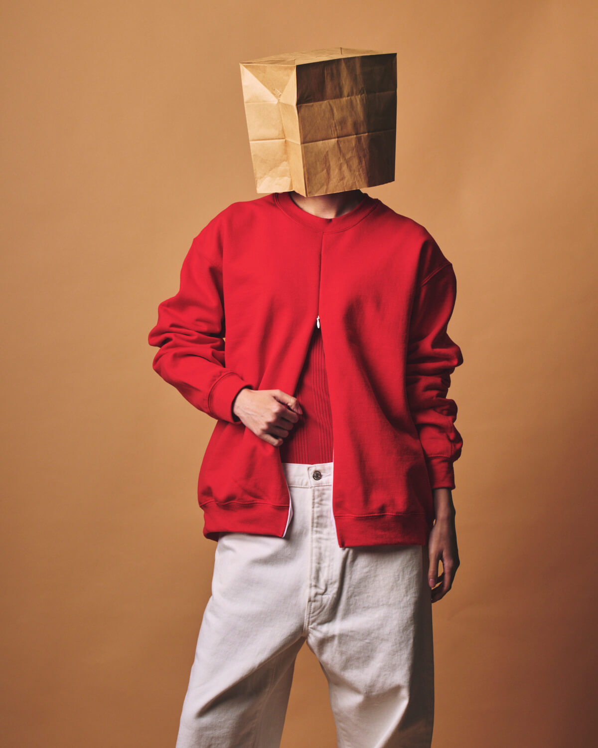 – REMADE IN JAPAN– 多くの方に愛され、着倒されながら時を重ねてきた、PRE_の名作スウェット[PRE_ F&B OPEN SWEAT]。 「また着たい」「もう一度出会いたい」という数多くのお客様の想いに応えるかたちで、待望の復活となりました。 今回の復活では、m.uのこだわりとして、ファスナーカラーをボディーカラーとはあえて異なる別カラーで仕上げ、閉じている状態では主張しすぎず、開けたときにだけ感じる遊び心をプラスしています。 Black、Red の body には White zipper、Gray body には Black zipperを組み合わせました。 フロントとバック中央にそれぞれ配置したファスナーは、開閉によって表情が大きく変わり、インナーを覗かせたり、レイヤードを楽しんだりと、スタイリングの幅を広げてくれます。 季節や気分に合わせてファスナーの開き具合を調整できるのも、嬉しいポイントです。 シルエットは当時の魅力を活かしつつ、サイズ展開にもこだわりました。 これまで主流だった大きめを着たゆったりとしたシルエットから、最近ではややコンパクトなサイズ感へと、トレンドが少しずつ移り変わってきています。 その変化を踏まえ、あえて一つの正解に絞ることなく、それぞれのスタイリングやバランスに合わせてお選びいただけるサイズ展開としました。 一枚でさらっと着るのはもちろん、コンパクトに着てボトムスとのバランスを楽しんだり、あえてゆとりのあるサイズを選び、インナーとのレイヤードで遊んだりと、気分やスタイルに合わせた着こなしをお楽しみいただけます。 シンプルでありながらも確かな存在感を放つ、特別なスウェットに仕上がりました。