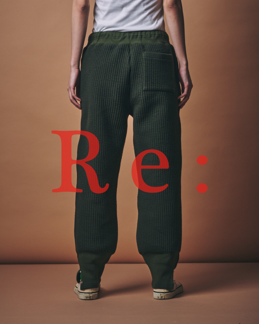 – MADE IN JAPAN– 大変多くのお客様よりご好評いただきましたm.u 凸凹 L/Sと同素材で製作したm.u 凸凹 PT。 素材には、厚みのある、キルティングのような雰囲気が出るように編まれた生地を用いており、中綿が入っているにも関わらず、本縫いステッチが入っていないため、伸縮性も兼ね備えています。 ウエストと裾には編み立てリブを付けており、裾リブは途中で編み方を変えることで裾からリブ上に向けて自然と広がるような形となっています。 また、裾は外側を割り、スナップボタンで開閉可能な仕様としているため、裾を絞ったままのシルエットやボタンを開けてお好みの靴と合わせていただくなど、様々なスタイルでお楽しみいただけます。 ポケットは両サイドはもちろん、片側にバックポケットを配置。 ウエストにはゴムを通しながら紐を付けているため、お好みのウエスト位置でご着用いただけます。 表地が自然に斜行していることでケーブル編みのような雰囲気も感じさせ、生地の厚みがあることではっきりと表れる肉厚な凸凹が絶妙なボリューム感と立体感のある動きを創り出しています。 なお、当商品はすべての生産工程を日本で行っております。